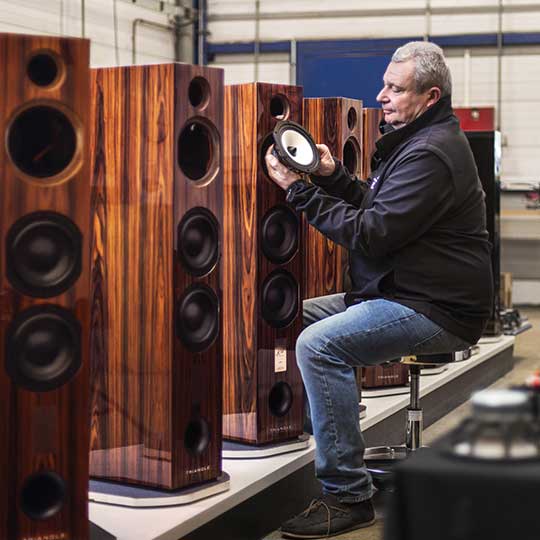 Depuis 40 ans, TRIANGLE conçoit et assemble ses enceintes de prestige dans son atelier Soissonnais. Une équipe d’ingénieurs collabore étroitement avec l’unité de production, assurant ainsi une qualité de fabrication hors pair et conforme à un cahier des charges précis et détaillé.