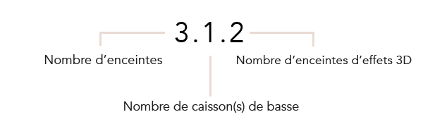 - Le premier chiffre donne le nombre d’enceintes placées sur le plan horizontal de votre installation (enceintes avant, centrales et surround).