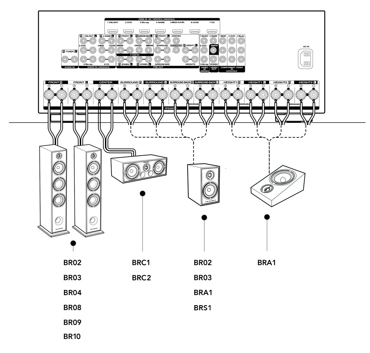 - Débranchez votre amplificateur du secteur lors du branchement de vos enceintes. Veuillez-vous référer au manuel de votre amplificateur pour la connexion de vos enceintes et leur attribution en fonction de leurs positions dans votre pièce.