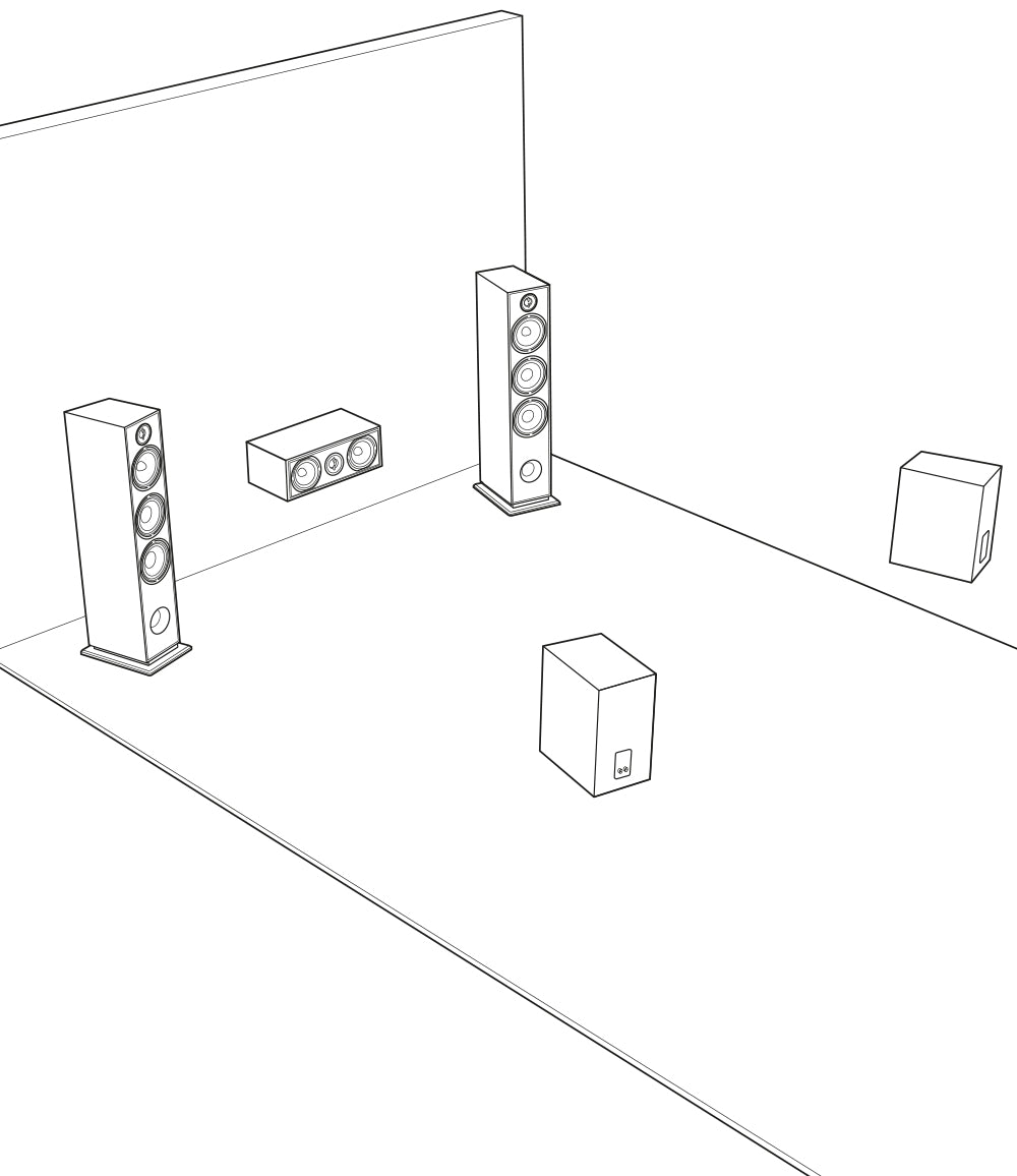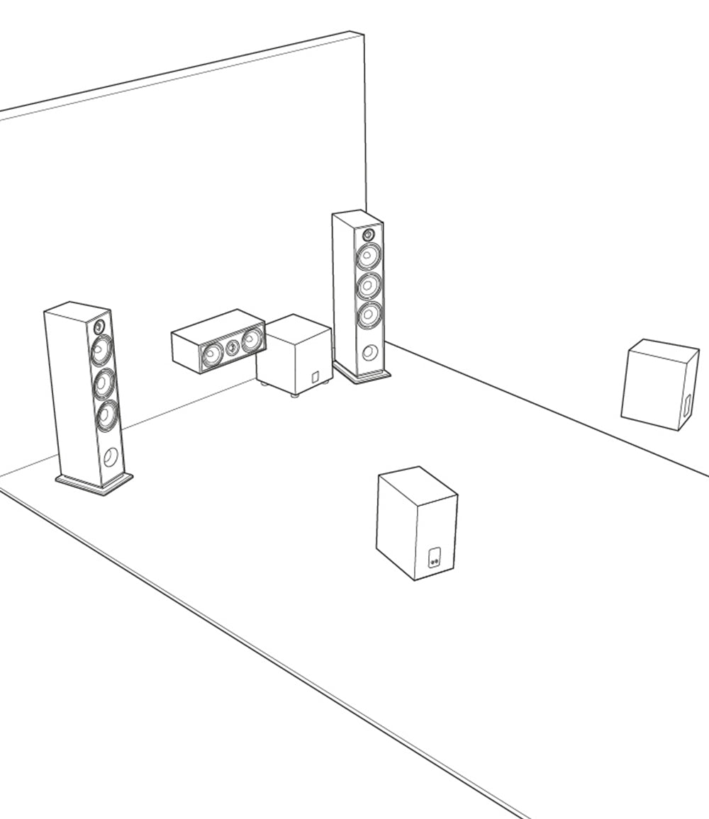 Le placement du caisson (SW) n’est pas critique. Sauf si la fréquence de coupure est au-delà de 80Hz, dans ce cas rapprochez le caisson des enceintes avants.
