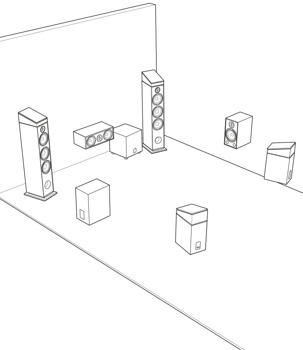 Cet ensemble comprend donc 7 enceintes sur le plan horizontal (2 avant, 1 centrale, 2 sur les cotés et 2 à l’arrière), 1 caisson et 4 enceintes d’effets (2 à l’avant et 2 à l’arrière).