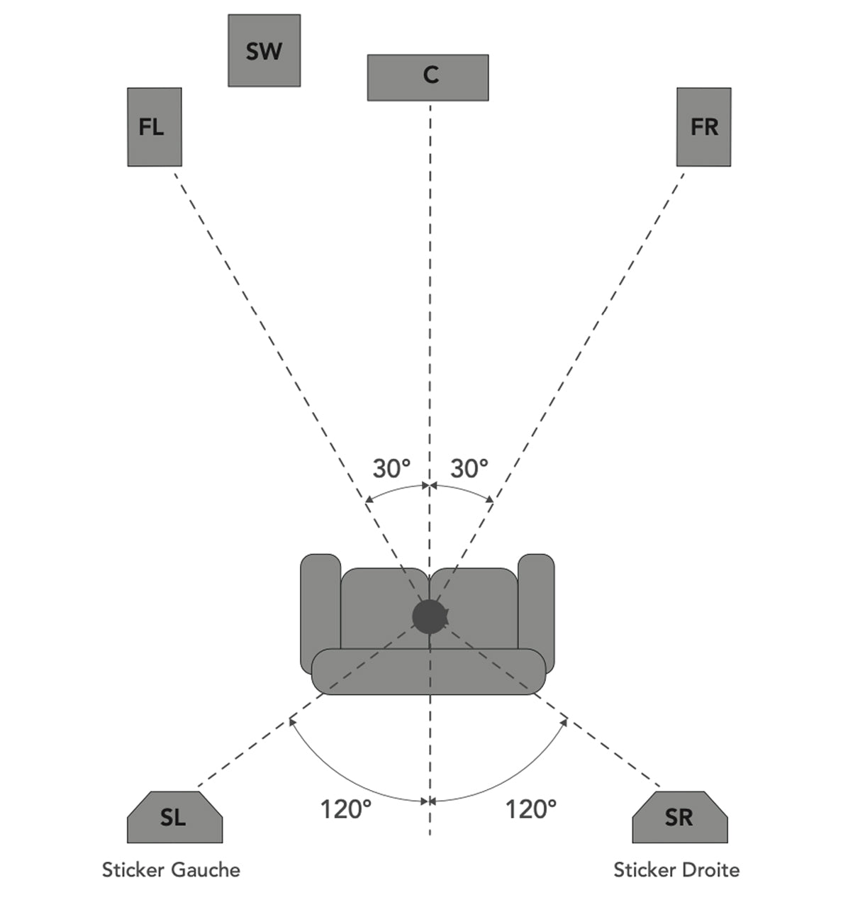 Votre zone d’écoute ne doit pas être trop proche des enceintes : une distance minimum de 2mètres doit être respectée. L’écart entre les enceintes avant (FL & FR) doit également être de 2 mètres pour garantir un bon effet stéréo.