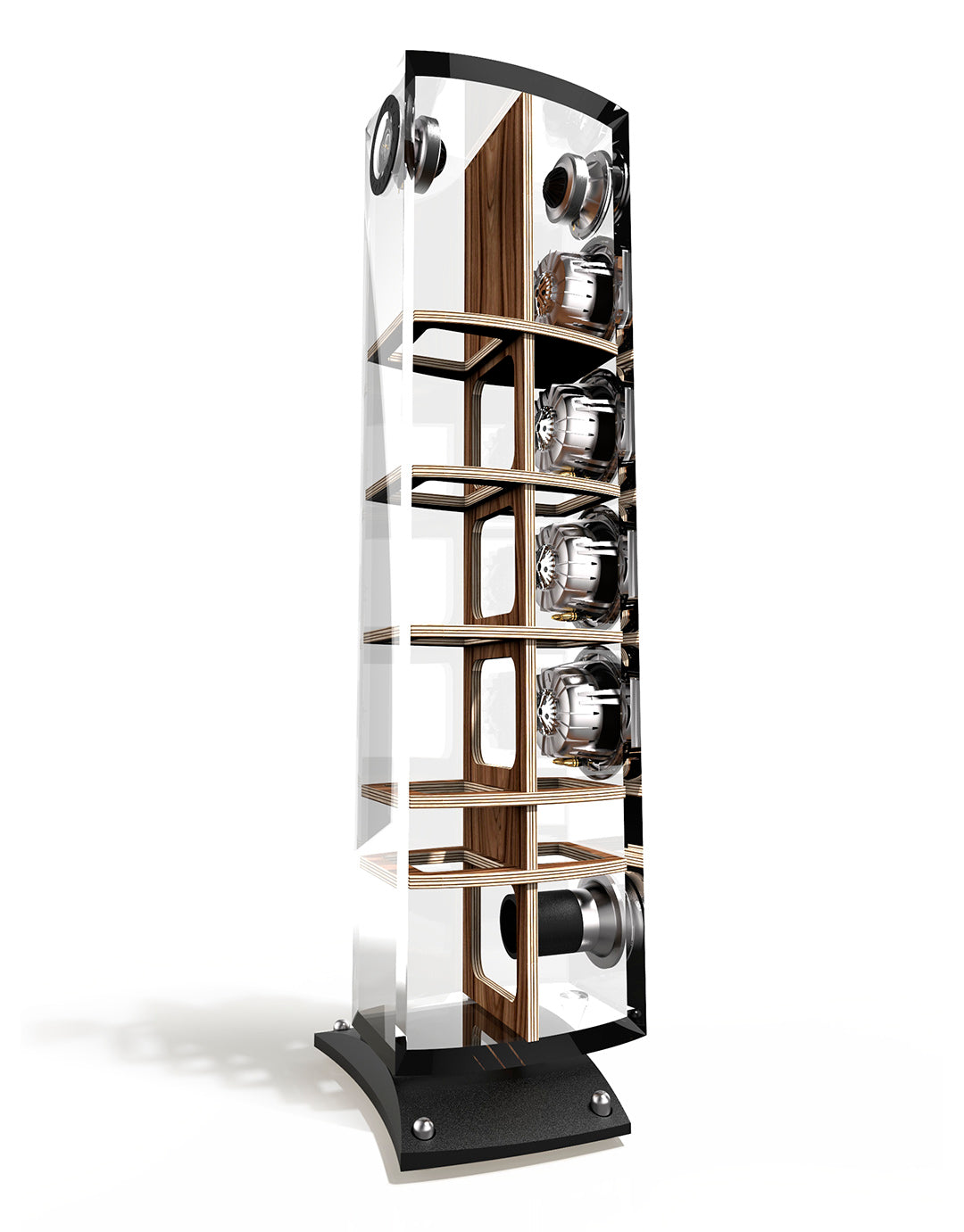 Ce coffret se caractérise par une architecture spécifique née d’une étude aboutie sur les phénomènes vibratoires et les microdéformations de l’ébénisterie. Des renforts ont été positionnés à des emplacements stratégiques, offrant la meilleure rigidité possible à l’ébénisterie face aux perturbations engendrées par le mouvement des haut-parleurs.