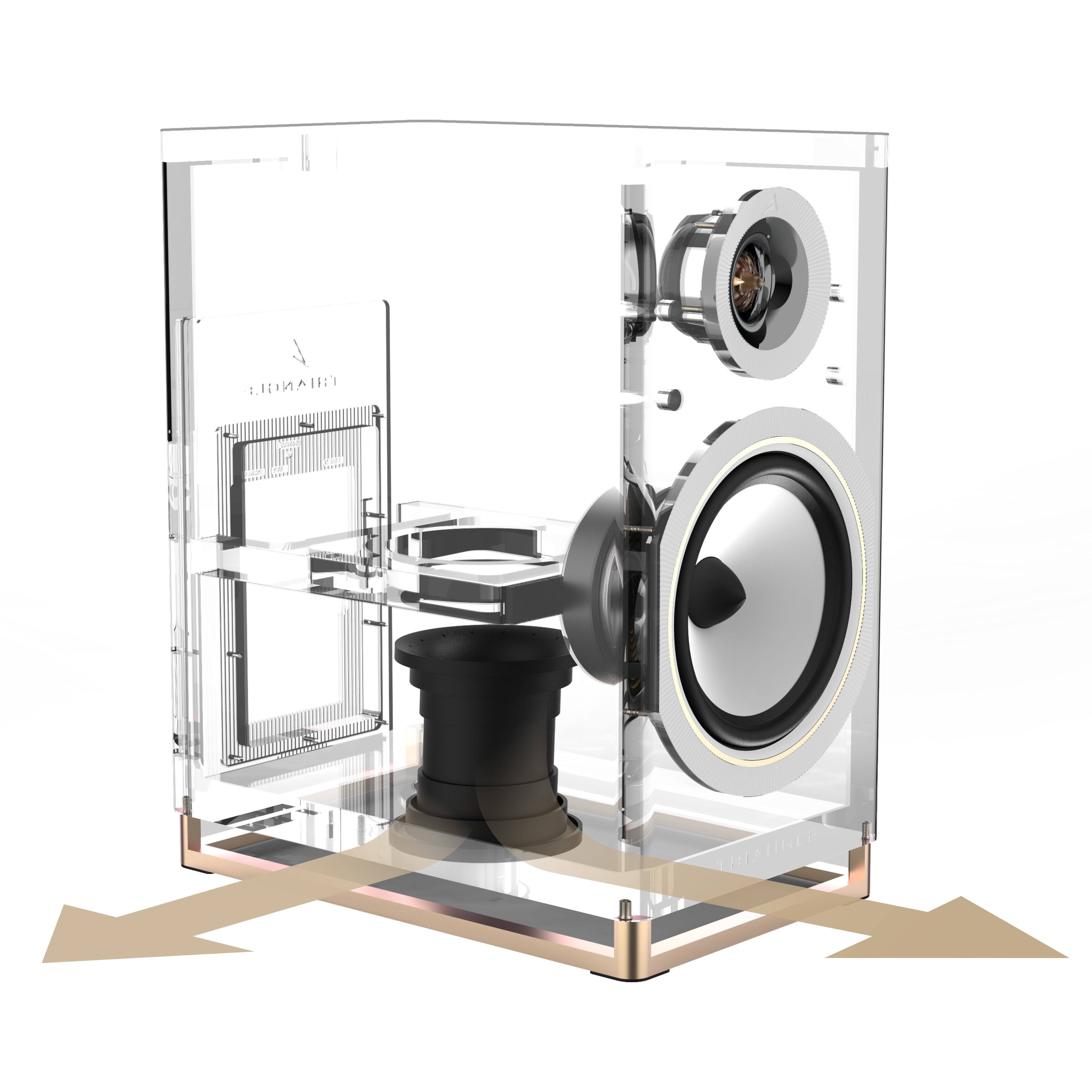 L’évent Bass-reflex orienté vers le sol permet une diffusion homogène des basses fréquences, sans perturbation du registre vocal.